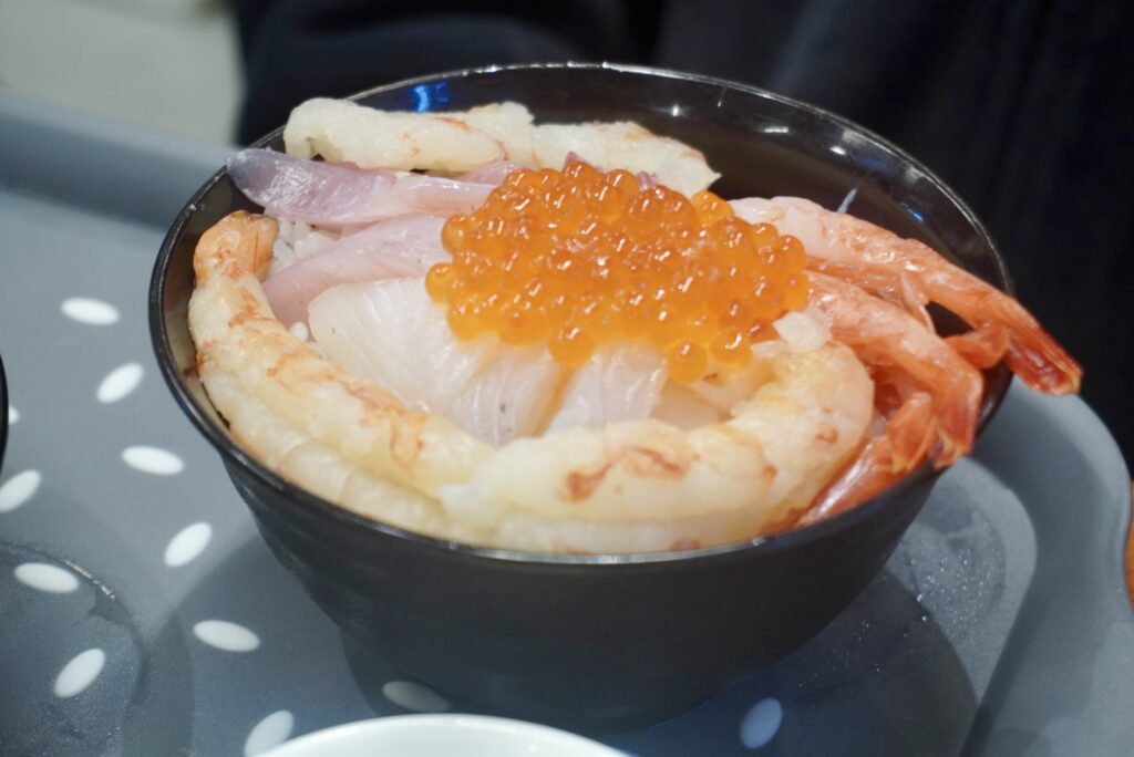最終日、朝7時にホテルを出発し、陸奥湊駅前にある八戸市魚菜小売市場の朝市へ行きました。新鮮な海鮮を購入して、ご飯のうえに自由にのせて食べる方式。学生たちの海鮮丼づくりのセンスが光りました。