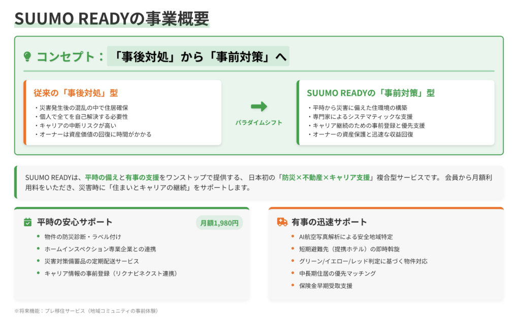「自然災害発生後、住まいに被害を受けられた方々に対して『SUUMO』ができることとは?」という課題に対して、「事前対策」によって被災の影響を最小化することを目的とした「SUUMO READY」を提案した。不動産業界における災害対策は、これまで「災害が起きてからどう支援するか」という事後対応が中心であり、居住者自身が事前に備える仕組みは十分に整っていないのが現状である。
