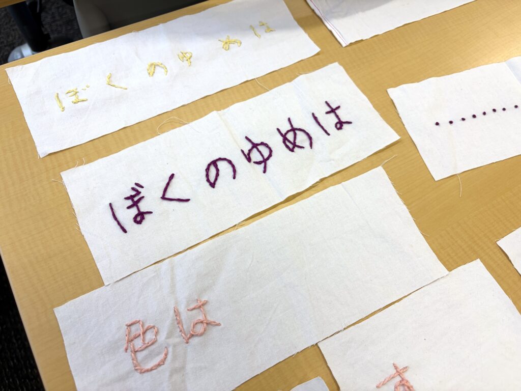 布に下書きで詩を写しとり、一文字ずつ時間をかけて、ていねいに縫っていきました。慣れない針と糸の作業もあったと思いますが、始まってみると集中して没頭して取り組むことができました。縫いながら、いろんな言葉を交わしあえていた風景もまた印象的でした。