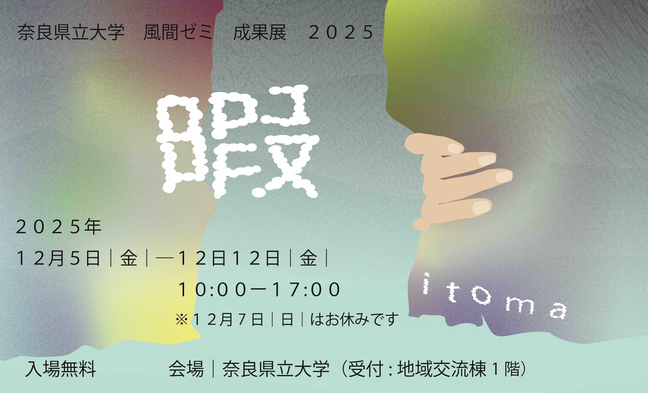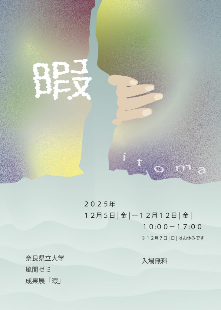 奈良県立大学風間ゼミは、「暇(いとま)展」を開催します。予定を埋め、通知に追われ、常に何かをし続けていないと不安になる——そんな日々の中で、何もせずただ “いる” ことを許される時間はどこにあるのでしようか。